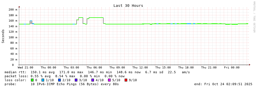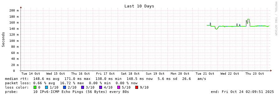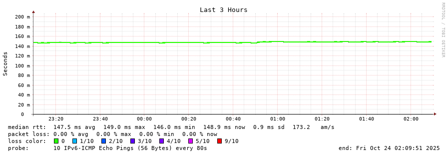 12 > 2001:4350:1:1::ff90 (2001:4350:1:1::ff90) [AS5438] 148.613ms 148.543ms 148.515ms