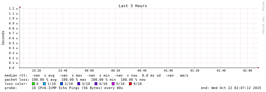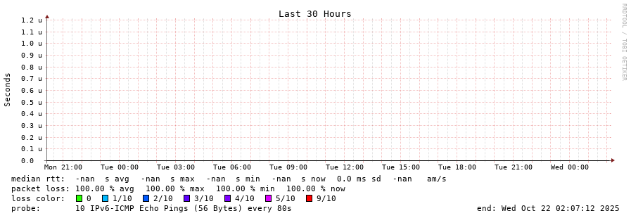 traceroute to fd69:226f:3a3c::2 (fd69:226f:3a3c::2), 30 hops max, 80 byte packets - Generated at 2025-10-21 22:30:01 3 > atl-b4-link.ip.twelve99.net (2001:2035:0:1f9c::1) [AS1299] 0.985ms !N0.769 ms!N